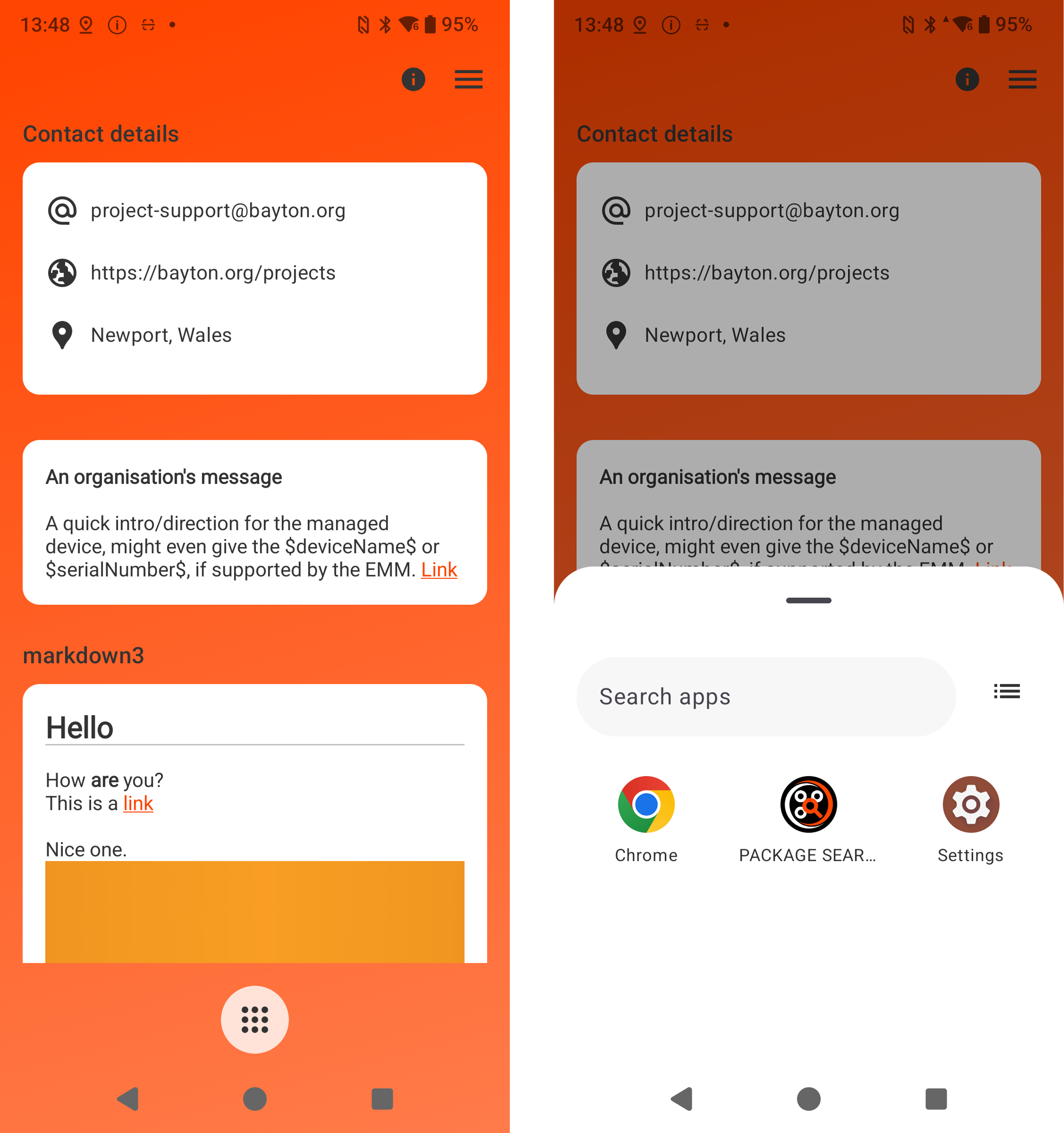 In terms of other changes in 1.1.8.0, this was predominantly about stability and performance, however the main new user-facing feature is an app drawer when MANAGED INFO is in launcher mode. The app drawer can be fully open, or limited only to the defined packages listed in managed config. It's pretty neat.