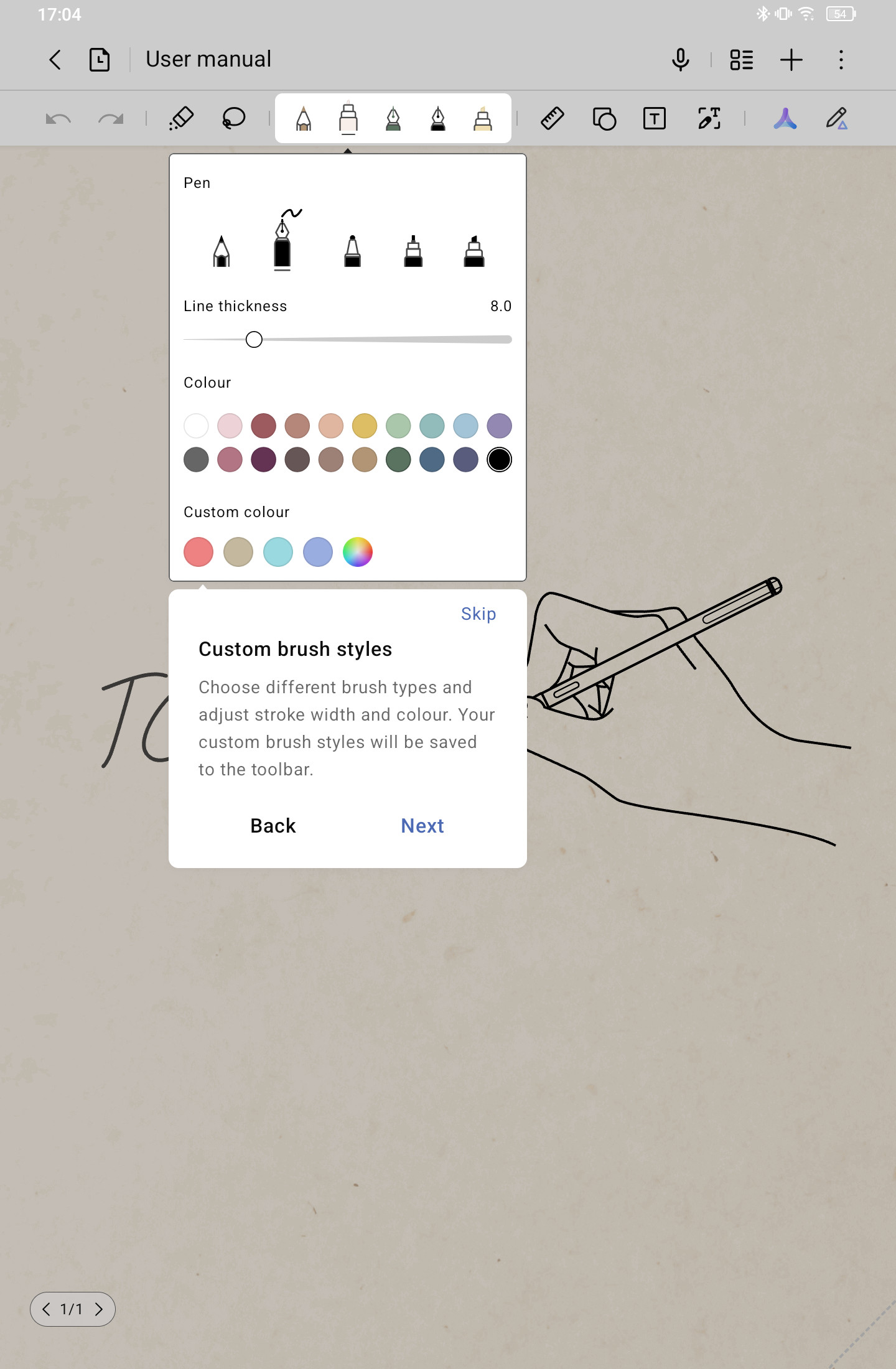 The writing tool configuration (the toolbar shown above a note when opened) is genuinely great. Each of the five tool slots can be individually configured - different pen types, colours, thicknesses - which means switching between presets is quick and not fiddly at all. I could set all five to the same pen tool with different colours if I wanted to, which depending on the complexity of the note may even be something I'll do.