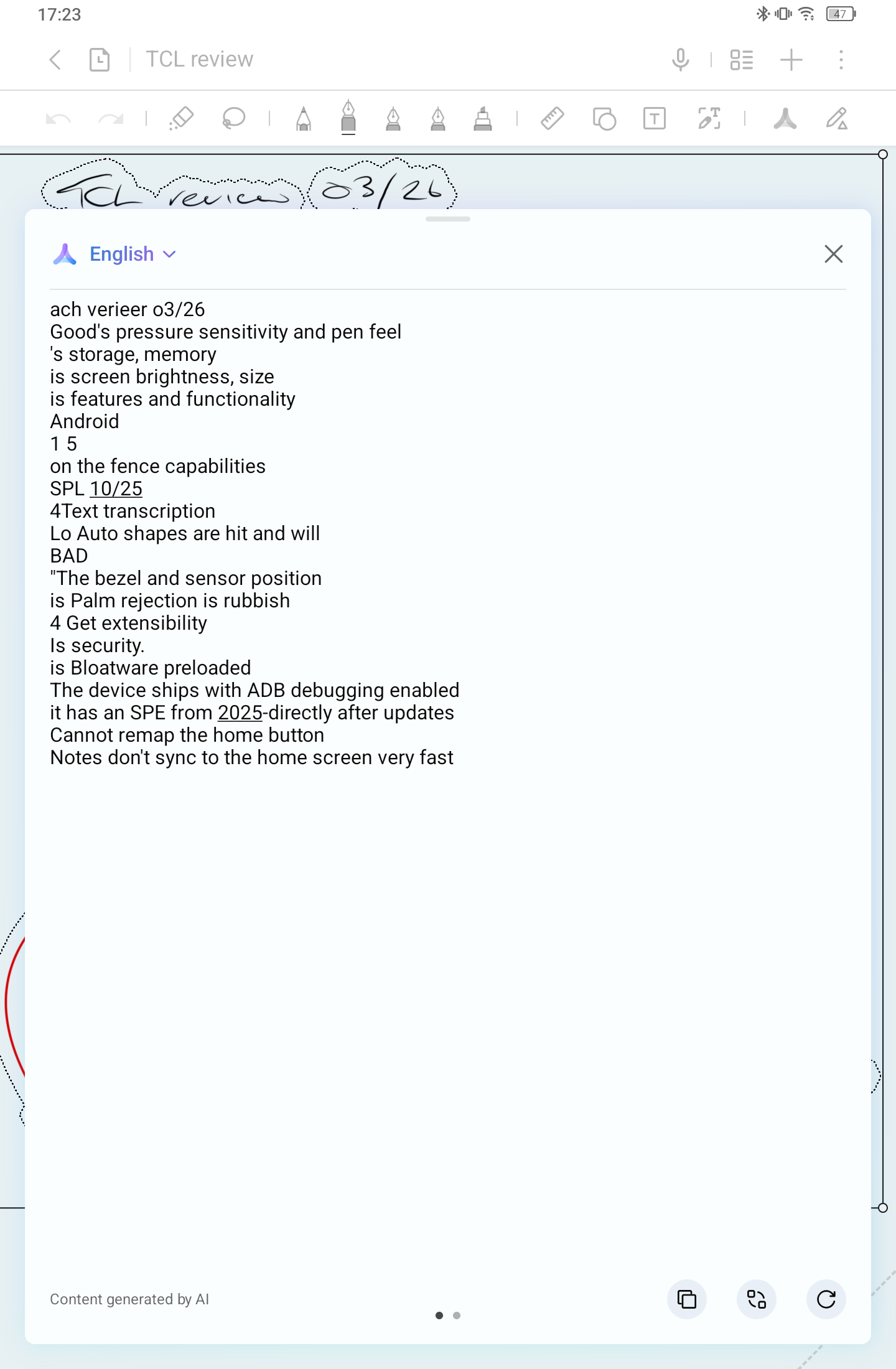 The base Android build is more solid than I expected. The notes experience has some genuinely nice touches - the writing tool presets and the ruler in particular - but is let down by poor transcription and some sluggish behaviour. The out-of-box software load is worse than it needs to be, and TCL's decision to strip out several standard Android settings while simultaneously shipping with ADB enabled is a strange combination.