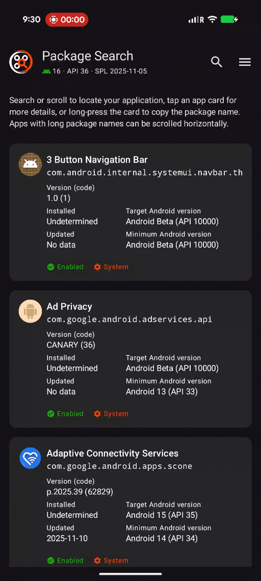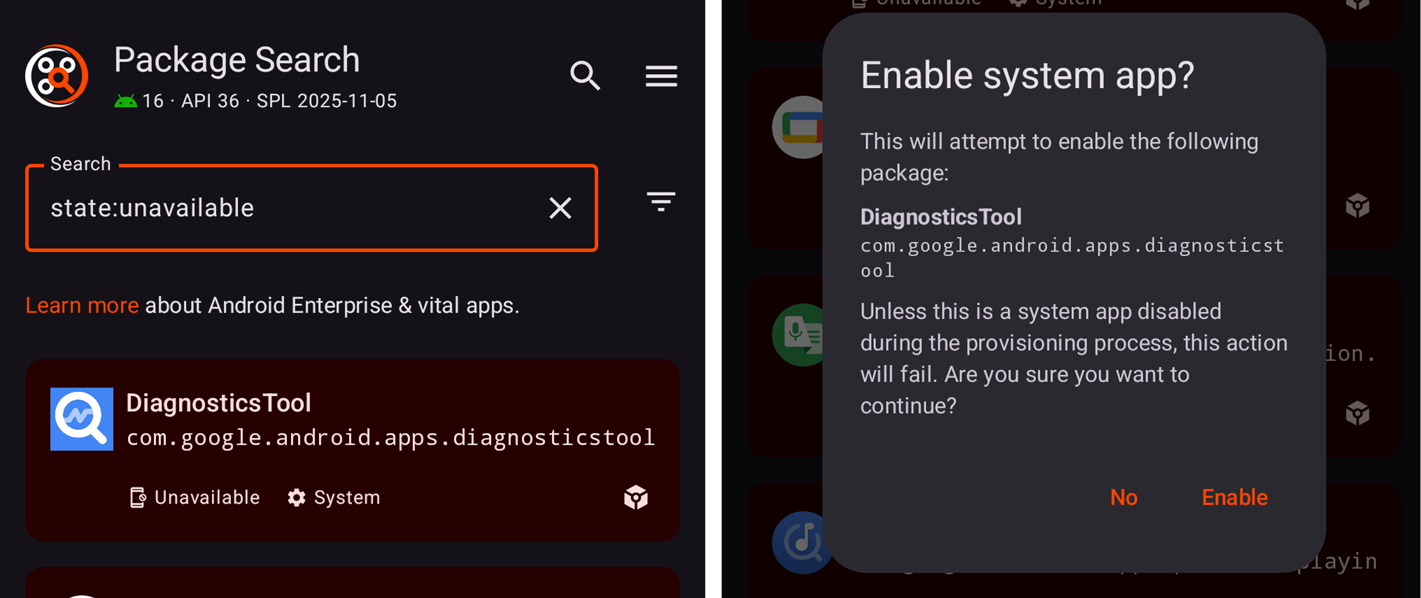 PACKAGE SEARCH is able to selectively enable unavailable system applications for devices running Android 8.0+.